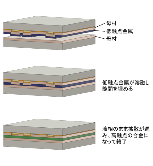 この液相になった低融点金属は接合面の細かな隙間へ広がり、均一に満たしていきます。その後、低融点金属は周囲の接合母材に対して拡散して次第に消失し、安定した固相の合金層が形成されます。