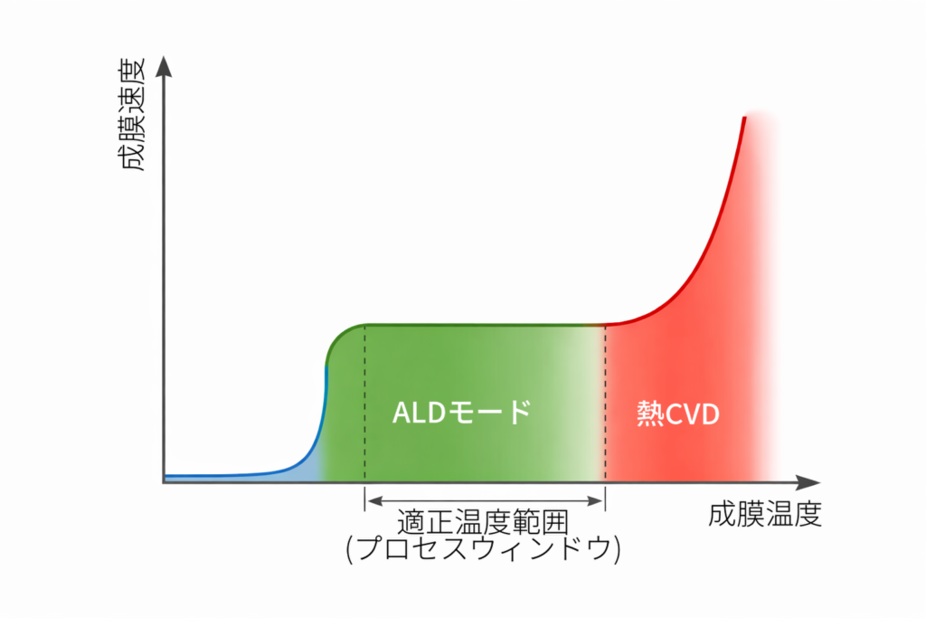 この温度領域が、ALDプロセスウィンドウです。